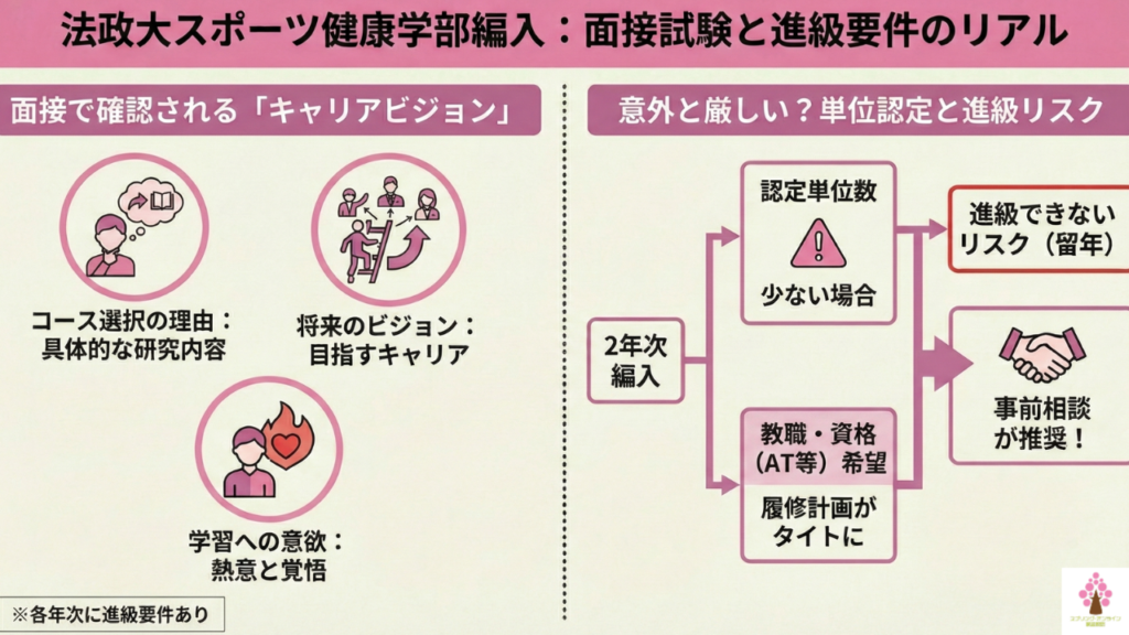 2年次編入であっても、前の大学での単位認定状況によっては、順調に3年生に進級できないリスクがあります。また、教職課程や資格取得(アスレティックトレーナーなど)を希望する場合は、さらに履修計画がタイトになるため、事前の相談が推奨されています 。